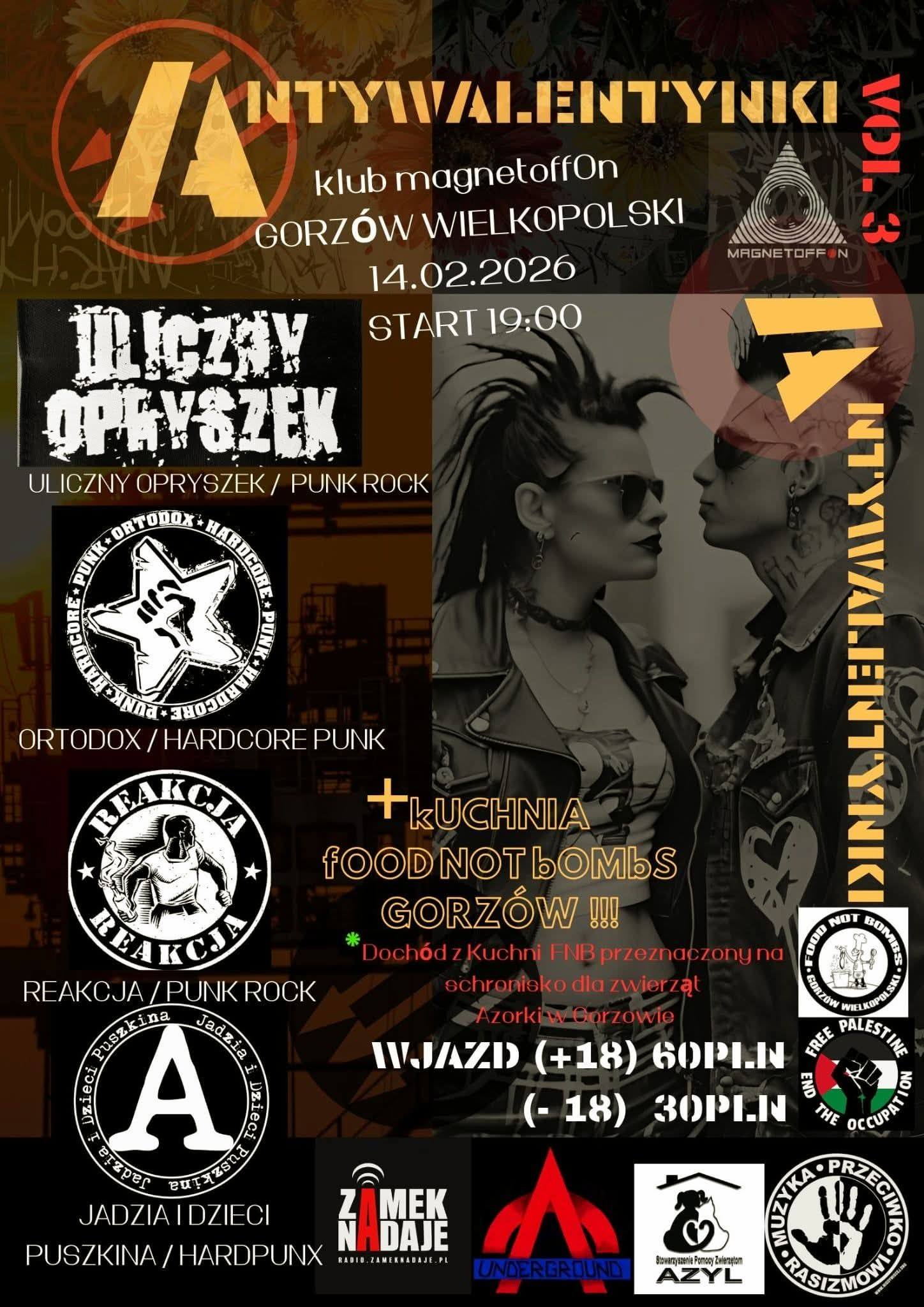 Antywalentynki vol. 3, czyli trzecia edycja punkowych koncertów w Gorzowie Wielkopolskim odbędzie się pod patronatem kampanii społecznej „Muzyka Przeciwko Rasizmowi” Stowarzyszenia „NIGDY WIĘCEJ”. Na scenie pojawią się: Uliczny Opryszek, Ortodox, Reakcja oraz Jadzia i Dzieci Puszkina.