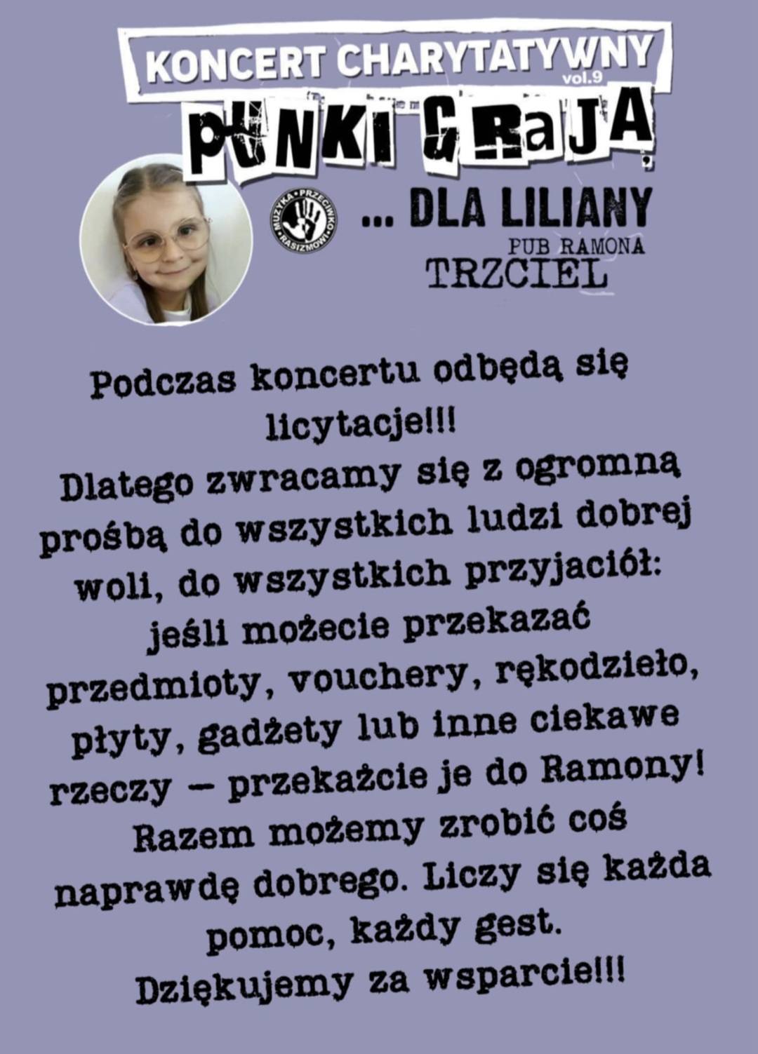 Koncert ma charakter dobroczynny – całkowity dochód z wejściówek oraz licytacji przeprowadzanych w przerwach między występami zostanie przekazany na pomoc Lilianie.